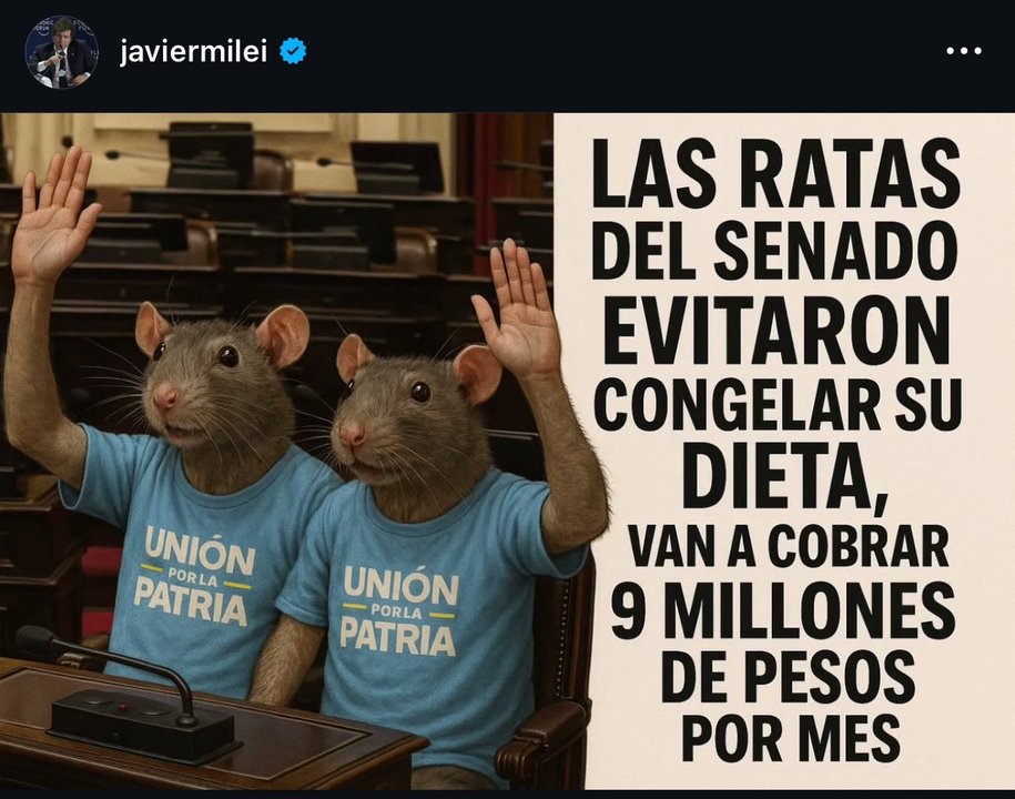 El mensaje que acompaña la imagen: «Las ratas del Senado evitaron congelar su dieta, van a cobrar 9 millones de pesos por mes».