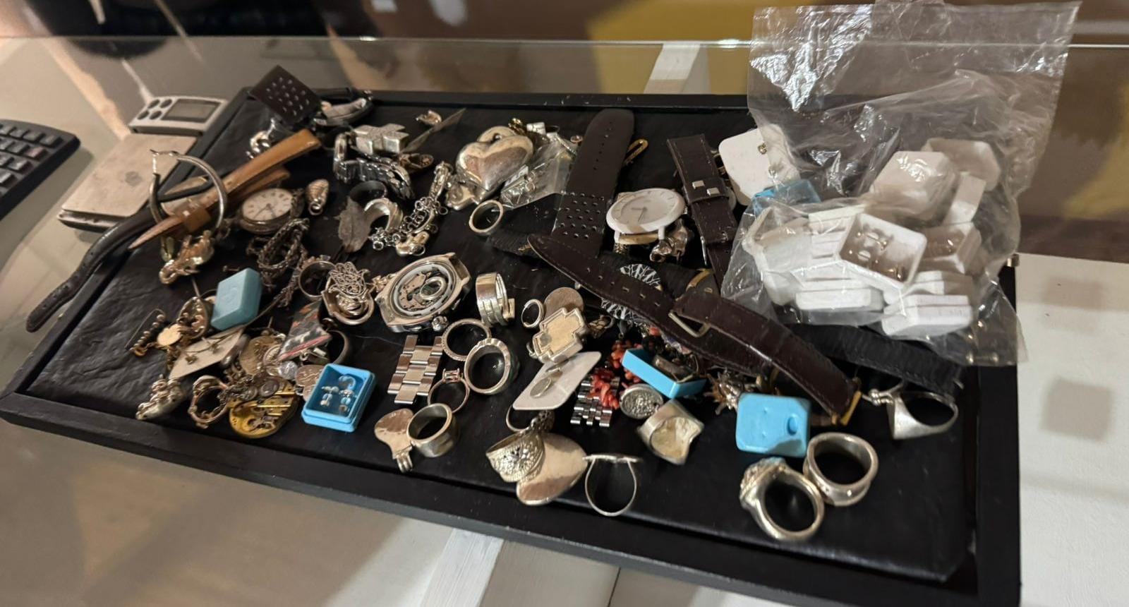 Cuando la policía llegó, el ladrón trató de huir. No llegó lejos: lo detuvieron a pocos metros y en su poder encontraron 28 relojes, 9 cadenas, 16 anillos y 14 pares de aros, todo listo para desaparecer en la noche.