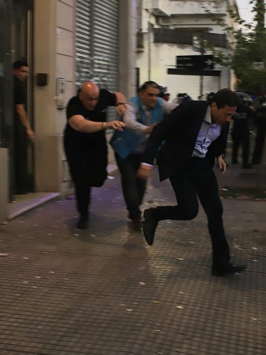 Su llegada generó una inmediata reacción de los hinchas, que se congregaron frente al edificio para manifestar su rechazo. Entre cánticos e insultos, exigieron su salida y la convocatoria a elecciones anticipadas. La tensión aumentó cuando los efectivos avanzaron con escudos para liberar la zona y permitir la salida del dirigente, que finalmente se retiró del lugar en una camioneta de la Policía.