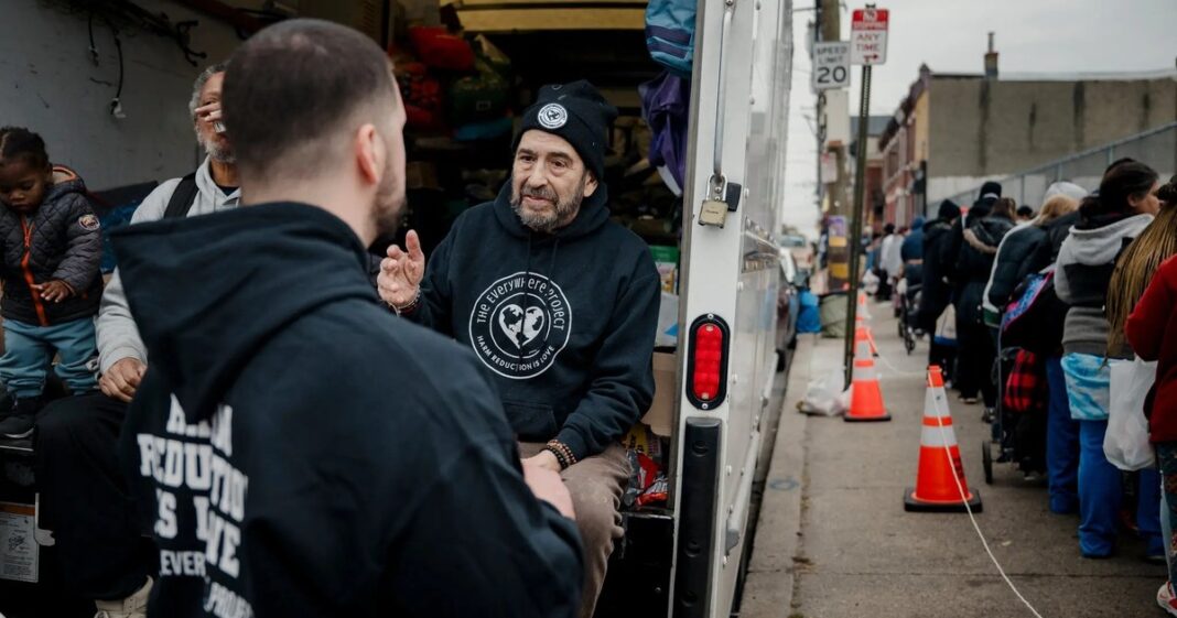 Hace unas semanas, Joseph caminaba por una vereda muy concurrida junto a la avenida Kensington, charlando con gente que hacía cola para recibir servicios y con quienes los prestaban. Cada sábado, la organización sin fines de lucro Everywhere Project, proporciona comida, ropa, primeros auxilios, suministros para el consumo seguro de drogas y flores hasta a 500 personas. Los organizadores estiman que aproximadamente tres cuartas partes de esas personas consumen drogas. Joseph es voluntario habitual. Hasta la primavera pasada, era cliente habitual.
