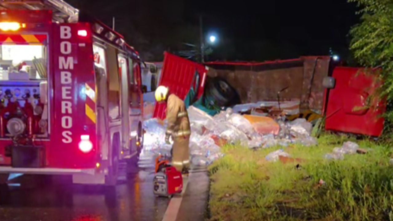 El hecho ocurrió cuando el conductor del vehículo, que circulaba en sentido norte-sur y transportaba bidones de agua y jugo, perdió el control y terminó volcando a la altura del ingreso al Balneario Municipal. El camión quedó sobre la calzada, con parte de la carga desparramada.