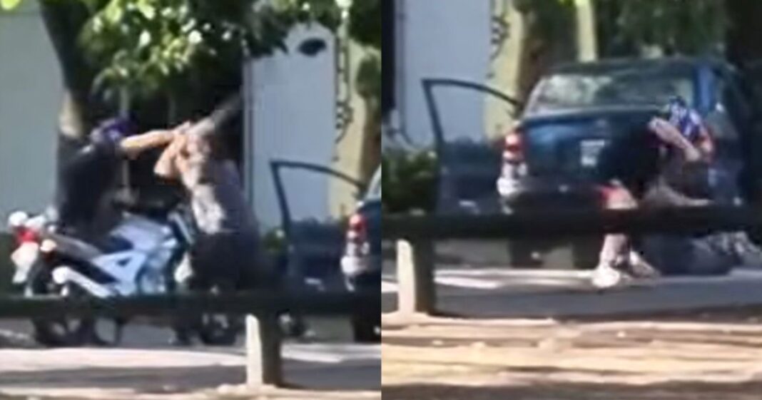 El motociclista, enojado, fue a increpar al conductor, a quien le gritó y le pateó la puerta. «Mirá como me rompiste la moto. Yo laburo todo el día», le gritó. Luego le arrojó un piedrazo. Así figura en un video que se difundió minutos más tarde, grabado por otro motociclista que estaba tratando de mediar.