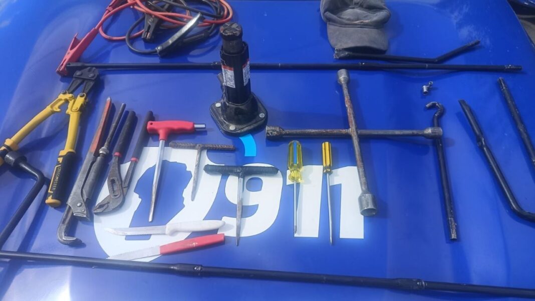 Al revisar el automóvil en el que se desplazaba, un Renault Logan, se verificó que contaba con pedido de secuestro solicitado por la justicia. Dentro del rodado se encontraron un gato hidráulico, dos cuchillos tipo Tramontina y diversas herramientas.